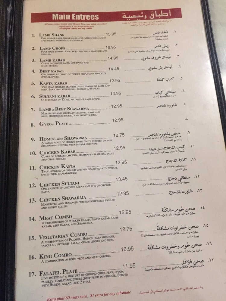 1 skewer of kofta and one of lamb kabob. Comes with hummus, rice, veggie salad, cucumber and yogurt sauce and one pita bread. All meat entres comes with hummus, rice, veggie salad, cucumber and yogurt sauce and one pita bread.